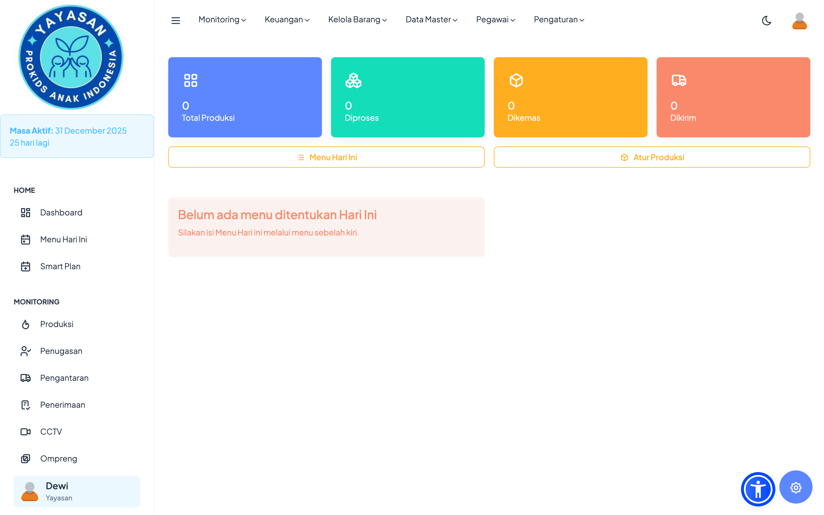 Home: Menampilkan ringkasan produksi hari ini, menu hari ini, dan kalender menu (Smart Plan).