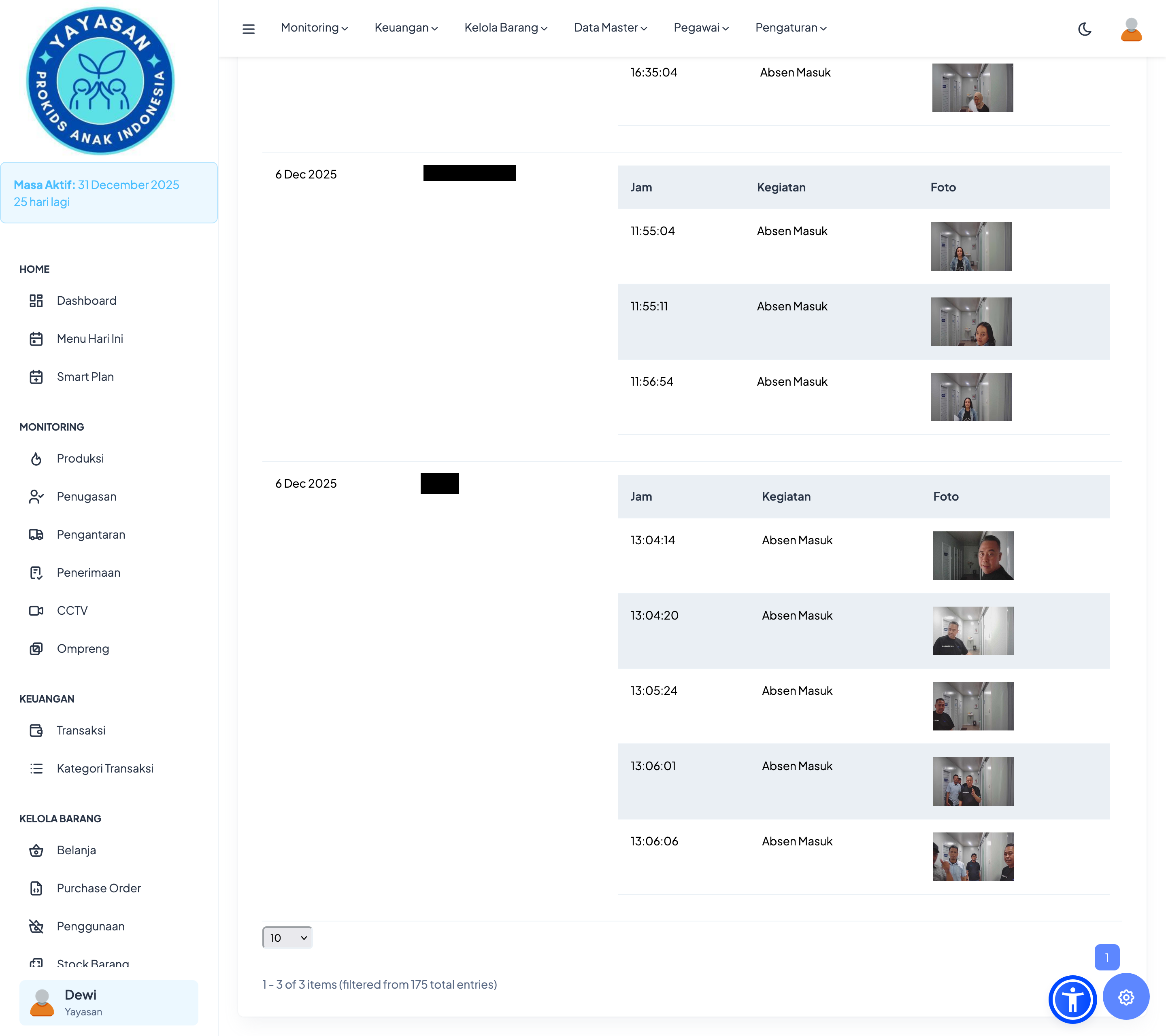 Monitoring → CCTV (menampilkan daftar pegawai yang hadir hari itu)