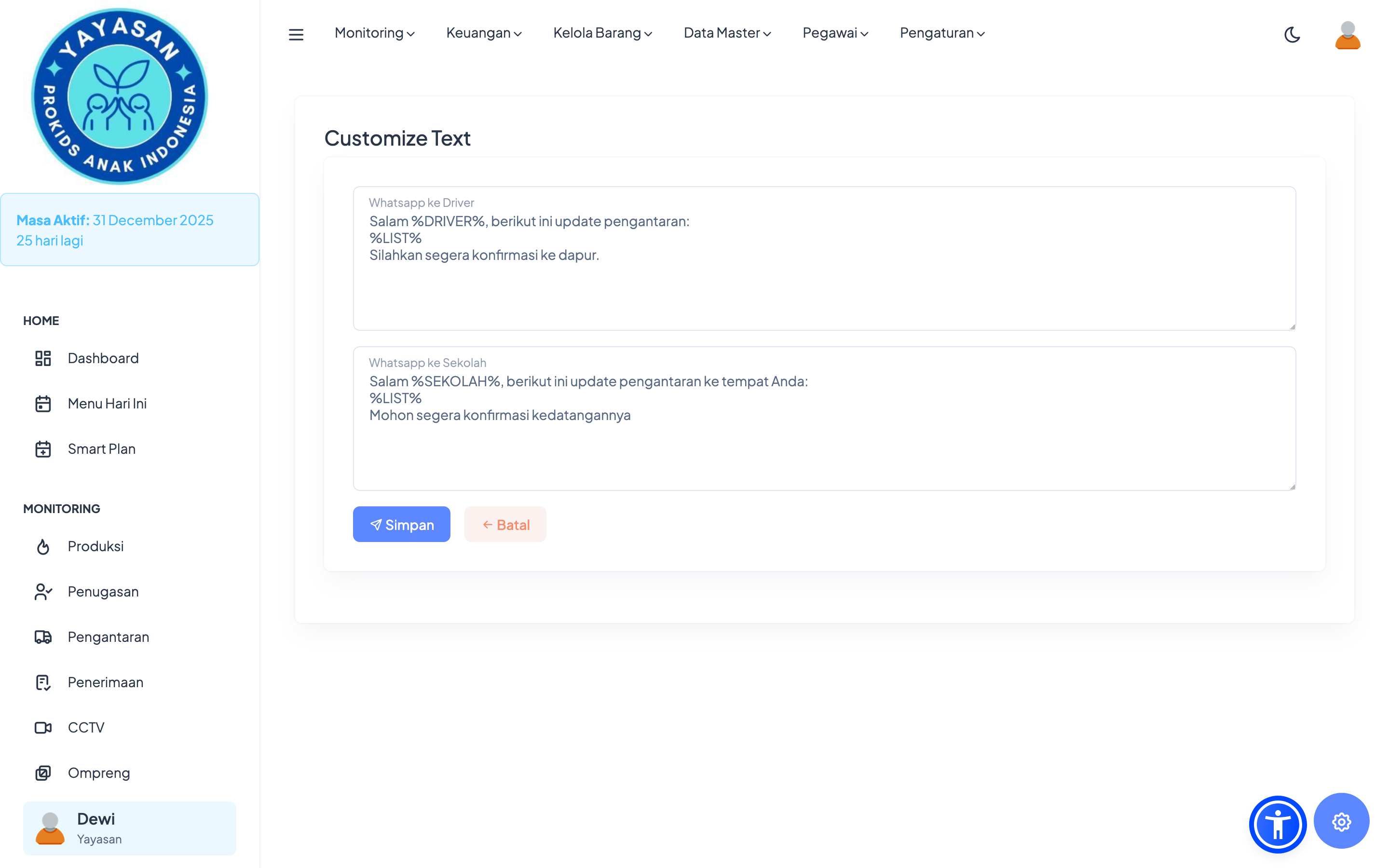 Sistem otomatis mengirim pesan WhatsApp ke driver (jika fitur aktif). Jika fitur diaktifkan, sistem juga mengirim pesan otomatis ke sekolah untuk memberi tahu bahwa pengiriman sedang menuju atau sudah tiba.