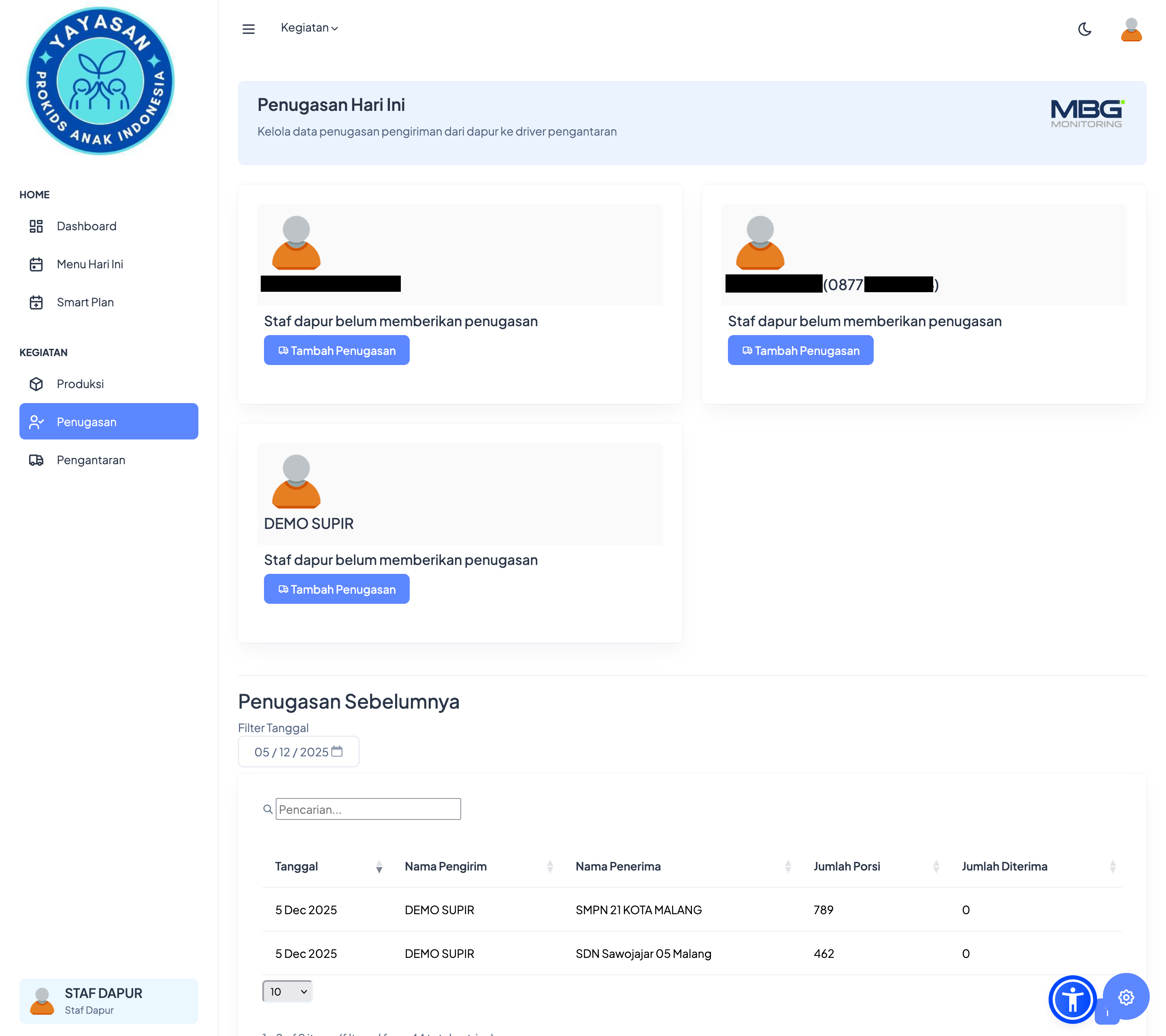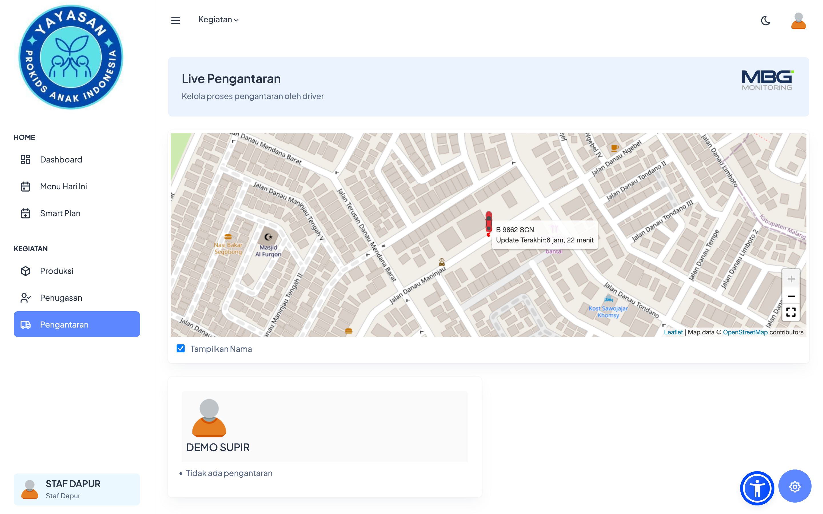 Proses pengiriman adalah tahap kritis dalam operasional MBG, karena memastikan makanan sampai ke sekolah tepat waktu, lengkap, dan tercatat dengan baik. Pada tahap ini, sistem memfasilitasi penugasan driver, pemantauan perjalanan, komunikasi otomatis melalui WhatsApp, hingga penerimaan oleh pihak sekolah.