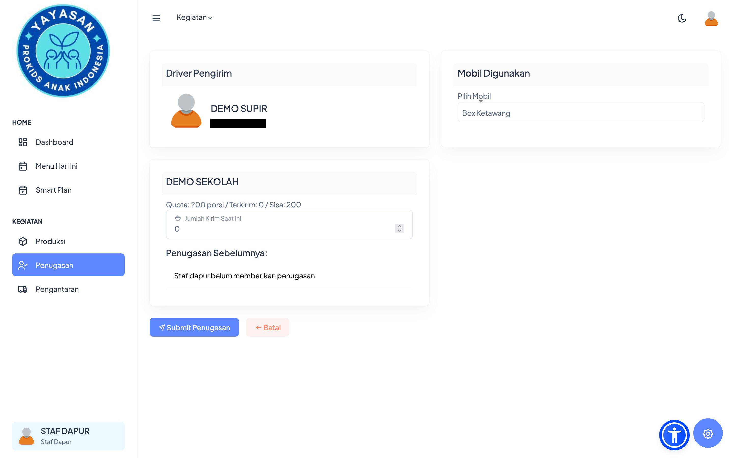 Modul Penugasan digunakan untuk menentukan driver mana yang mengirim makanan ke sekolah tertentu pada hari itu.