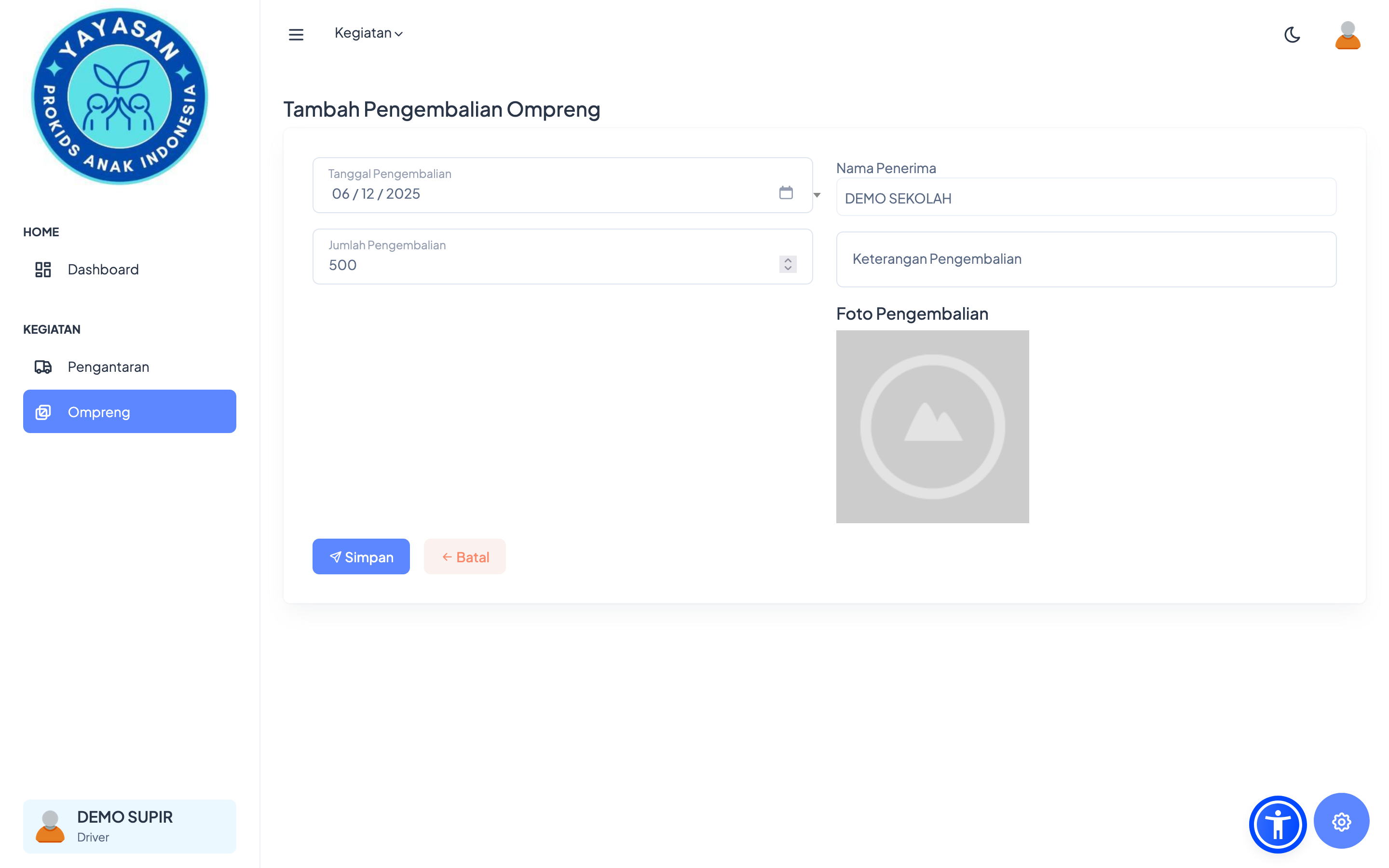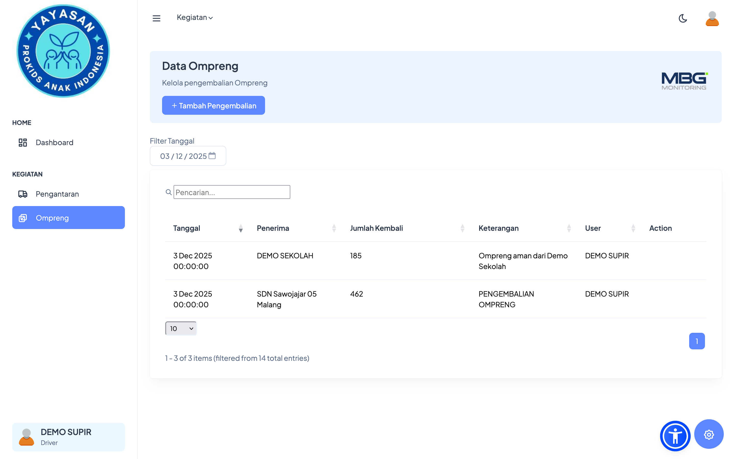 Setelah driver menyelesaikan pengantaran dan mengambil kembali nampan dari sekolah, jumlah nampan yang kembali harus dicatat.