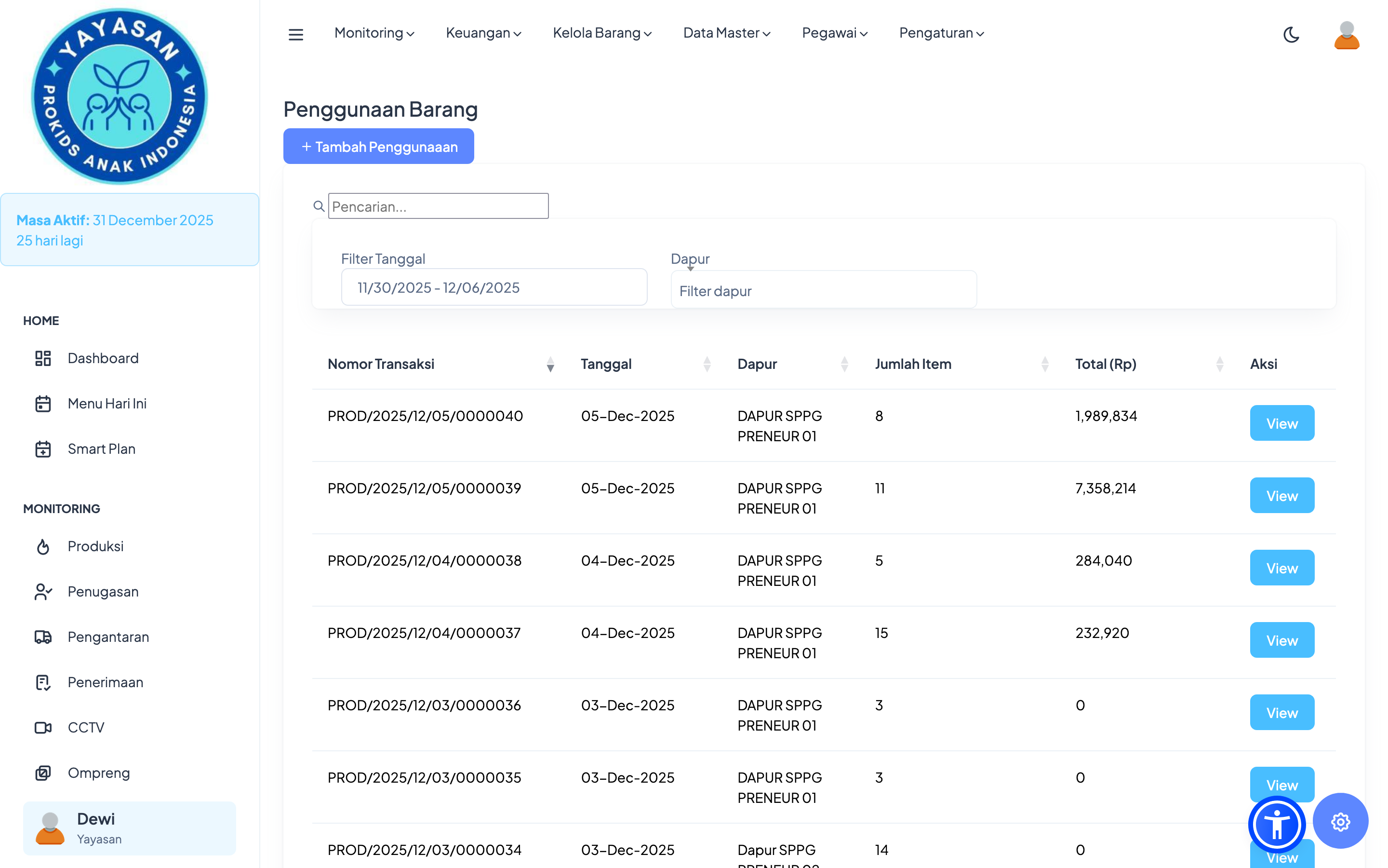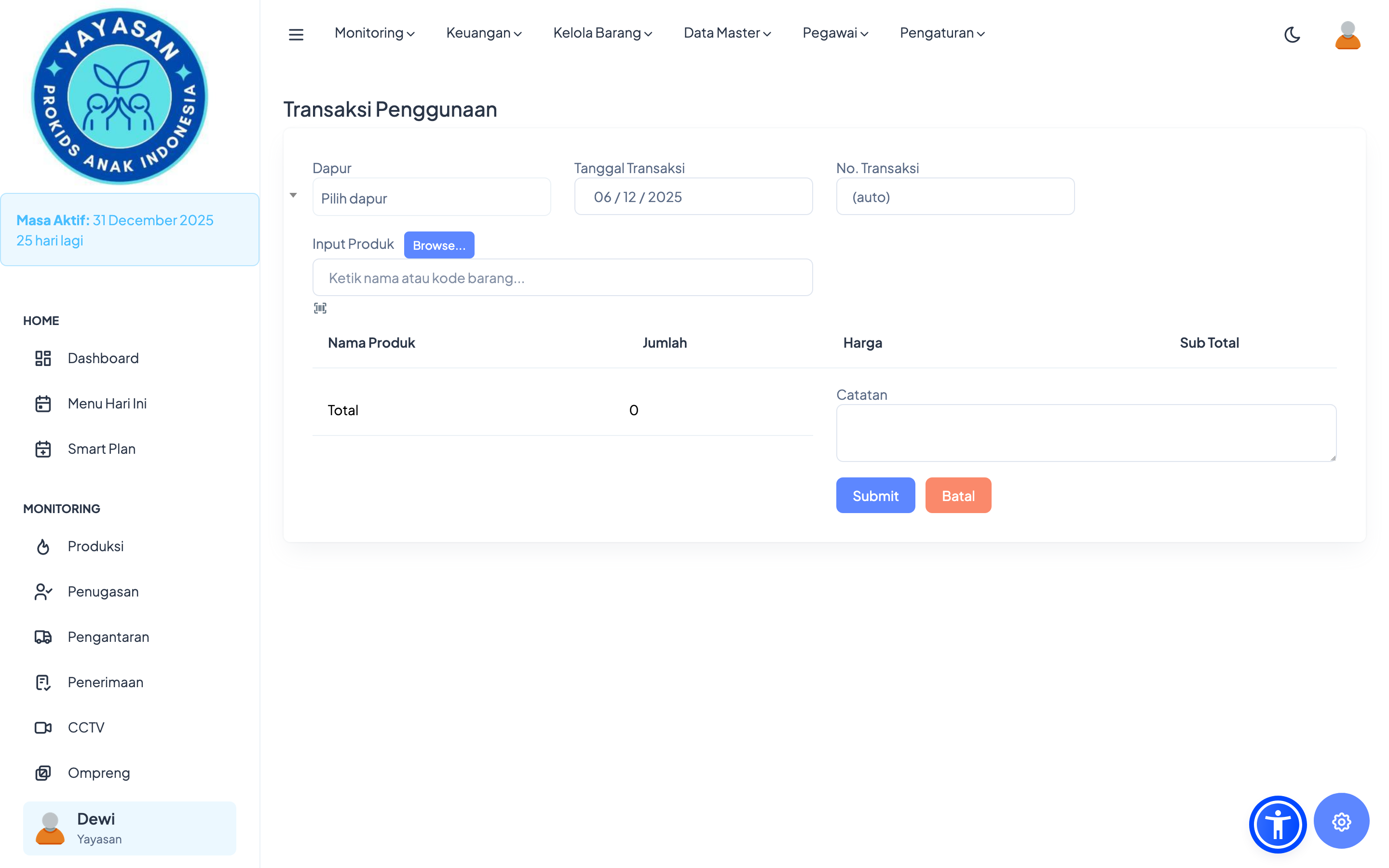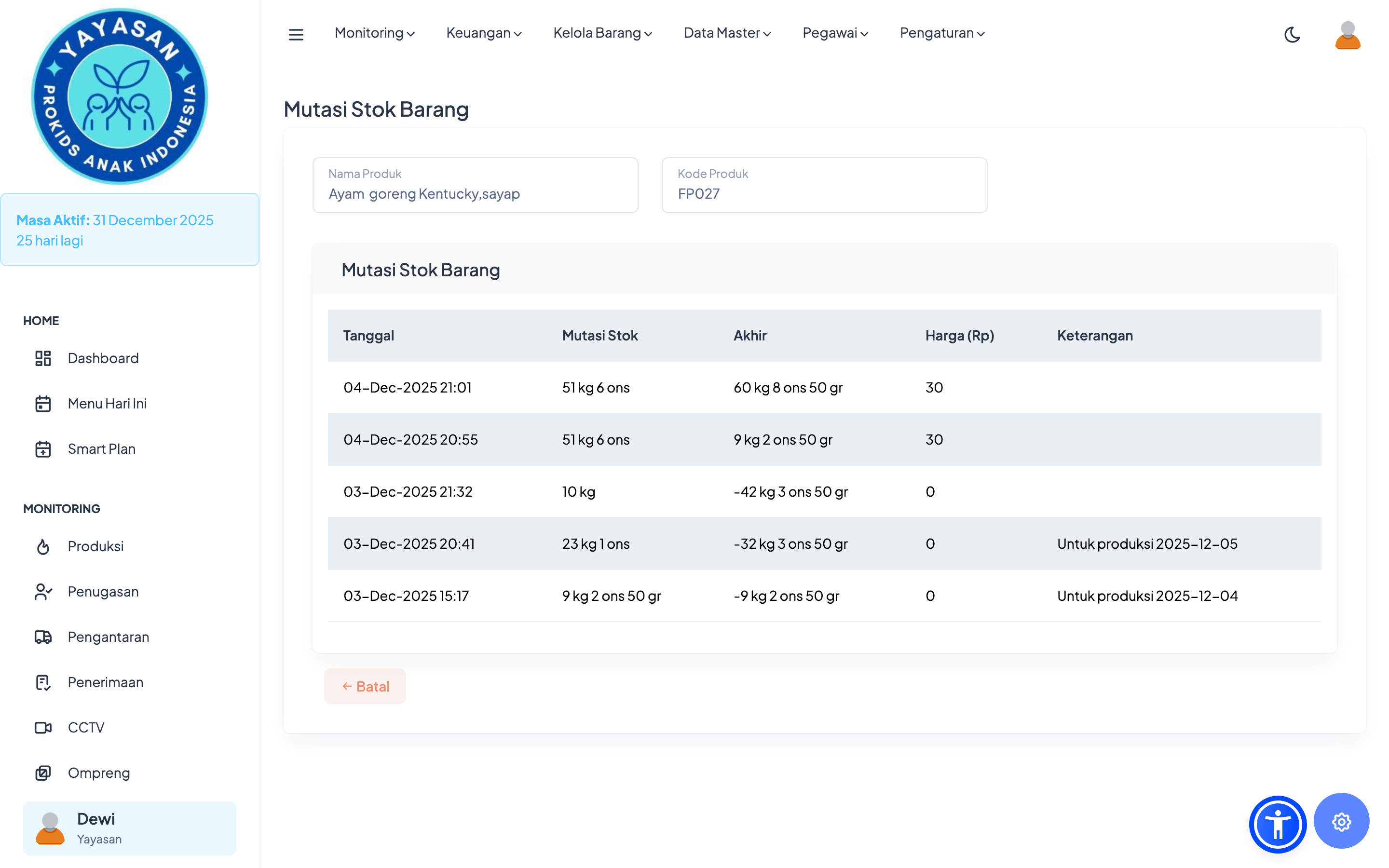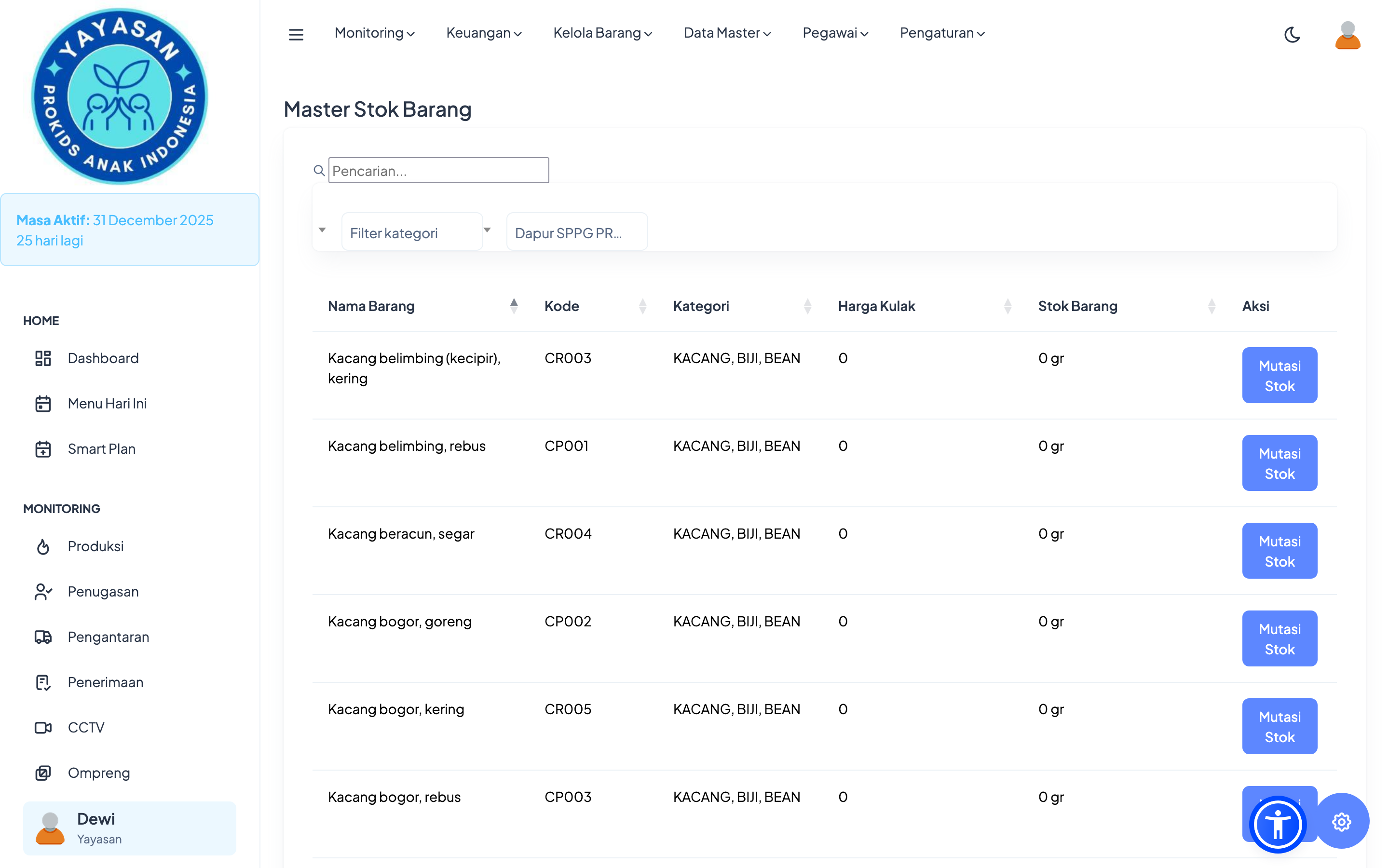 Modul ini menampilkan daftar seluruh barang yang tersedia di dapur, lengkap dengan jumlah dan status persediaannya.